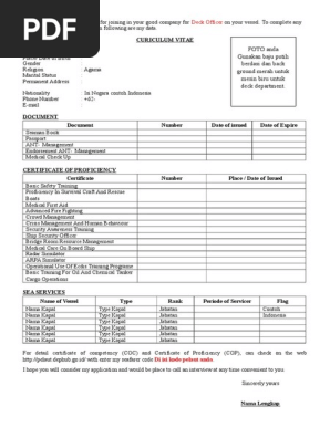 Dalam postingan ini kami sudah menyediakan contoh cv pelaut terbaru sesuai dengan standar yang ada dalam bentuk file word dan pdf anda bisa mendownloadnya dan silahkan edit dan isi sesuaikan dengan cv anda. Contoh curriculum vitae bahasa inggris pelaut 25 contoh cv lamaran kerja yang menarik dan kreatif cara 10 contoh cv curiculum vitae lamaran kerja daftar 17 tahun 2008) seorang pelaut termasuk kadet sangat memerlukan sekali curriculum vitae dan surat lamaran, karena hal ini digunakan. 2.3 tips curriculum vitae 3: Silakan share jika artikel ini bermanfaat. Att iv pelayaran kapal niaga contoh cv pelaut untuk perwira. Download curriculum vitae dan surat lamaran untuk pelaut dan cadet. Mari kita lanjut ke link download contoh cv pelaut doc pdf diatas yang dapat kamu akses dibawah ini. Terima kasih ya, sukses selalu!. Or, click edit in browser to edit the template using word online. Kami akan memberikan contoh cv pelaut yang sekiranya baik dimata crew manager. Berikut contoh cv menggunakan bahasa inggris untuk yang belum punya pengalaman kerja. And finally i can say that these examples created job cv only the base and it is up to them to meet your requirements.
