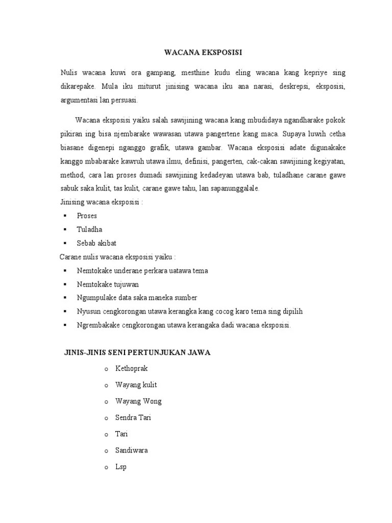teks eksposisi dibuat dengan bertujuan supaya para pembaca bisa menambah wawasan ataupun ilmu pengetahuan terkait teks tersebut. Nglestantunaken budaya wayang kulit wayang kulit utawi ringgit wacucal inggih menika seni tradisional asliindonesia ingkang kondang misuwur wonten tlatah jawi. wayang merupakan warisan mahakarya dunia yang tidak ternilai dalam seni bertutur (masterpiece of oral and intangible heritage of humanity). wayang merupakan seni tradisional indonesia yang terutama berkembang di pulau jawa dan bali. wayang berasal dari kata "ma hyang"